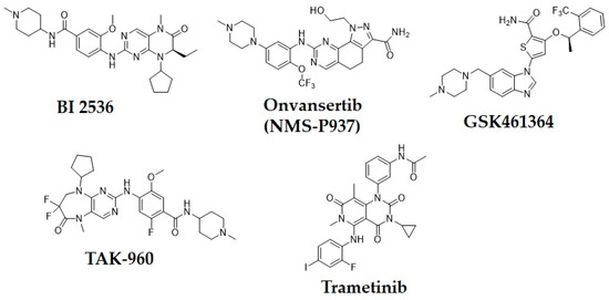 Consequently, inhibition of PLK1 has been an appealing goal for researchers, who have made substantial efforts to design and develop small molecule PLK1 inhibitors (Figure 1). The FDA has approved at least 55 small molecule anticancer kinase inhibitors as of February 2020 [14]. Researchers from Boehringer Ingelheim developed one of the earliest PLK1 inhibitors, BI2536, a dihydropteridinone derivative. It was the first pioneered PLK1 inhibitor to enter clinical trials for the treatment of cancer, however it was not very effective during monotherapy regimens in clinical trials [5,10,14]. One more Boehringer Ingelheim compound, volasertib (aka BI6727), is an ATP-competitive inhibitor that was developed by modifying the chemical structure of BI2536 and was shown to inhibit the growth of acute myeloid leukemia (AML) cell lines. However, when combined with Trematinib, BI6727 was more effective at arresting dual G1 and G2-M in an NRAS-mutant melanoma cell line [15]. Both of these drugs passed phase I and III clinical trials for breast cancer, B-cell lymphoma and AML but were found to be more effective in combination with other drugs and are no longer used in monotherapy [5,16].