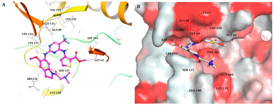 Molecular docking was performed to interpret the binding mode of the most active compound, 17, inside the active site of PLK1. We utilized an extended sampling protocol to perform induced fit docking that produced 80 binding poses for compound 17. All 80 poses were checked for a docking score and bonding and non-bonding interactions. One of the poses displayed a docking score of −12.04 and yielded a binding pose with PLK1 that was similar to that witnessed between the co-crystallized ligand (BI6727) and the protein (PDB ID: 3FC2) (Figure 3). This pose was chosen to analyze further interactions. The most active compound 17 docked within the binding pocket, mimicked the binding mode of ATP, and formed three hydrogen bonds (H-bonds) with crucial active site residues of PLK1. The hydrogen and nitrogen atoms from the aminopyrimidine ring of compound 17 formed 2 H-bonds with the key hinge region residue CYS133. This interaction was also observed in previously reported docking studies of several other PLK1 inhibitors including BI6727, which was considered important for inhibition of PLK1 [3,4]. Another H-bond was found between the oxygen atom from the dimethylamino-propan-2-one moiety at R3 position and the residue SER137. This moiety docked very well within a pocket lined primarily with residues of the kinase C-lobe, including SER137 that formed the floor of the C-lobe [4]. In addition, pyrimidine ring formed pi–pi interaction with GLU131, which is also a part of the hinge region. Overall interactions were alike to those observed between a co-crystallized ligand and PLK1. Hence, the docked pose of compound 17 validated a strong binding conformation.