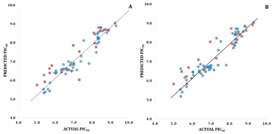 (A) Scatter plot for the selected CoMFA model; (B) Scatter plot for the selected CoMSIA model; the plot shows the actual pIC50 versus predicted pIC50 activity of the training and test sets; the training set compounds are represented as blue diamonds; the test set compounds are represented as dark red squares.