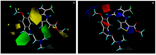 Contour maps for the selected CoMFA model. (A) Steric contour map; (B) electrostatic contour map; green contours show the region is favorable for bulky substitutions, and yellow contours show the region is unfavorable; blue contours favor electropositive substitutions, whereas red contours favor electronegative substitutions.