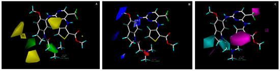 Contour maps for the selected CoMSIA model. (A) Steric contour map; (B) electrostatic contour map; (C) hydrophobic contour map. Green contours show regions that are favorable for bulky substitutions, whereas yellow contours show unfavorable regions; blue contours favor electropositive, while red does not. Magenta contours show the regions favorable for hydrophobic substitutions, whereas cyan contours show unfavorable regions.