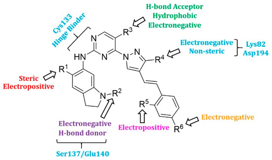 Furthermore, red and blue contours were observed near the aminopyrimidine ring at the R3 position among which, red contours seemed to be position specific. Therefore, the presence of blue contours at this position showed that electropositive groups were favorable, which could be verified by looking at key hydrogen bond interactions of amine groups with the hinge region residue CYS133 in the docking study of compound 17. Another red contour was seen near the indoline ring at the R3 position, which meant that electronegative substitution was favorable at this position. This was verified with a docking study of compound 17 where H-bond interactions were found between the oxygen atom from dimethylamino-propan-2-one moiety and the residue SER137. Compounds 13, 33, and the most active compound 17, which have moderate to high activity, could be the result of this.