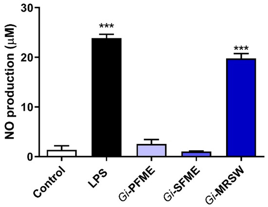 NO production determined based on the amount of nitrite by the Griess reaction. RAW264.7 cells were treated with LPS (200 ng/mL) or polysaccharides (Gi-PFME, Gi-SFME, and Gi-MRSW) at 40 µg/mL for 24 h. The culture medium was collected and analyzed for nitrite levels. *** p < 0.001 according to ANOVA followed by a Dunnett’s multiple comparison post-test.