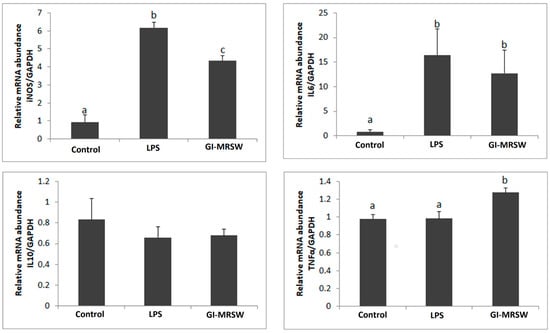 Relative mRNA abundance determined by qPCR after 24 h of the treatment using GAPDH as a housekeeping gene. RAW 264.7 cells were treated with LPS (200 ng/mL) or fraction Gi-MRSW at 40 µg/mL for 24 h. Different letters represent groups with significant differences in gene expressions pattern.