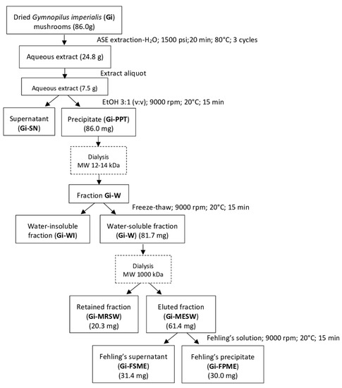 Wild mushrooms of G. imperialis were lyophilized and grounded in a mortar using a pestle yielding 86 g of dried powder. The extraction process was performed by using ASE 350 equipment (Accelerated Solvent Extractor, Dionex ASE 350, Thermo Fisher Scientific, Waltham, MA, USA) [20,56]. Briefly, 84.0 g of material was mixed with 56.0 g of diatomaceous earth (Sigma, CA, USA), and the mixture was loaded onto the 66 mL extraction cell between two 0.45 μm cellulose membrane filters. Distilled water was used as a solvent for the extraction under 1500 psi at 80 °C. Heat time was set to 5 min, with 5 min static time, 60% flush volume, 120 s purge time, and three static cycles. One hundred milliliters of solution yielded by the extraction were concentrated under reduced pressure and then lyophilized (Labconco FreeZone 2.5 L Benchtop, EUA).