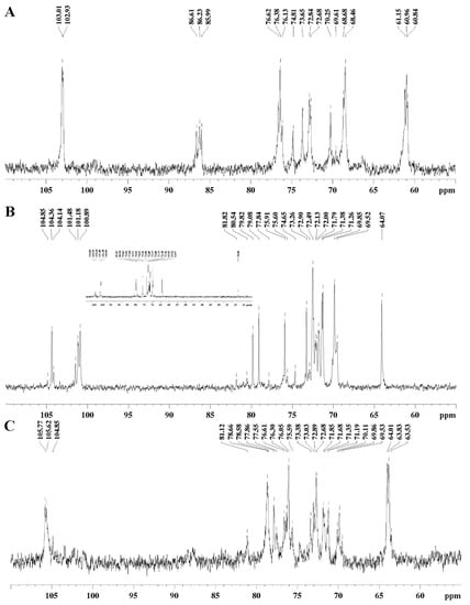 13C NMR spectra of the Gi-MRSW (A), Gi-FPME (B), and Gi-FSME (C) fractions obtained at 70 °C from the basidiomata of Gymnopilus imperialis.