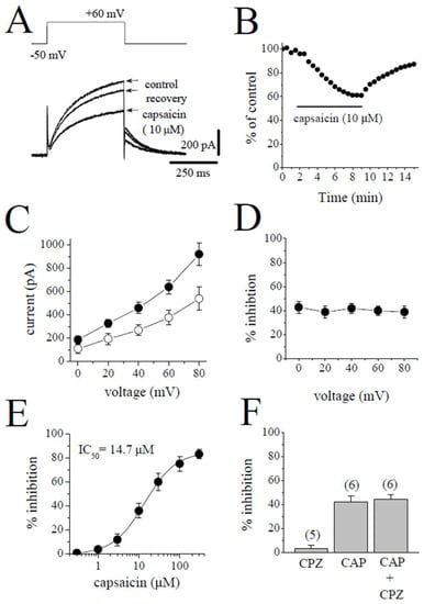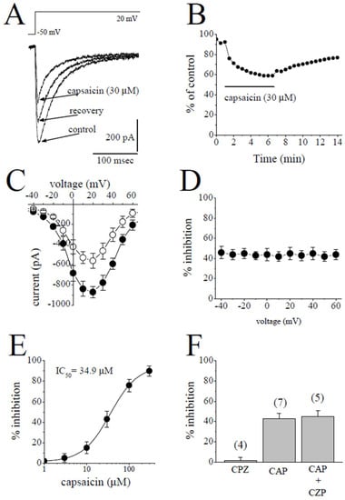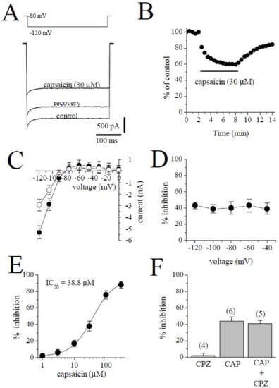 IK1 was activated from the holding potential of −80 mV to the test potential of −120 mV. The amplitude of IK1 was determined by measuring the peak current relative to zero current. The traces of the currents in the control, in the presence of 30 µM capsaicin, and during recovery are shown in Figure 6A. Figure 6B shows the time course of the capsaicin effect and washout on IK1. The I-V relationships of IK1 in the absence and presence of 30 µM capsaicin are presented in Figure 6C (n = 5). The relationship between the test potentials and the extent of the capsaicin inhibition of IK1 is presented in Figure 6D (n = 5). Figure 6E demonstrates the concentration–inhibition curve of capsaicin on IK1 (n = 4–6 cells). The IC50 and apparent Hill coefficient were 38.8 µM and 1.4, respectively. Capsazepine (3 µM) alone did not affect the peak amplitudes of IK1. The extent of capsaicin inhibition of IK1 was not altered by the co-application of 3 µM capsazepine and 10 µM capsaicin (Figure 6F; p > 0.05; t-test).