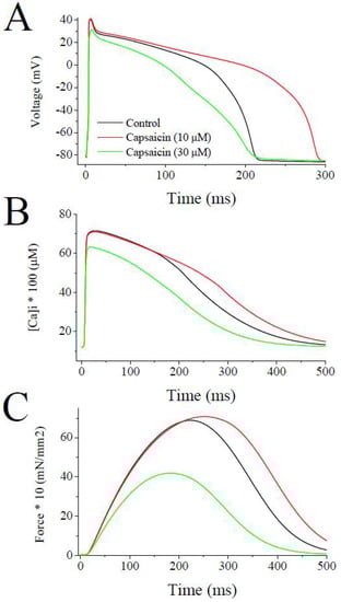 The simulation with LabHEART, a computer model of rabbit ventricular action potentials [31], revealed that the suppression of IKs, IKr, and Ito at a concentration of 10 µM, capsaicin, as expected, causes a marked prolongation (39%) of action potential duration at 50% repolarization (APD50), whereas the addition of the inhibition of INa, IL-Ca, and IK1 at higher capsaicin concentration (30 µM) results in a 27% shortening of APD50 (Figure 7A). In earlier studies, capsaicin at concentrations higher than 1 µM has been reported to prolong APD in rat ventricular [23,24] and guinea-pig atrial [19] myocytes. On the other hand, capsaicin, at concentrations of 10 µM and higher, has been shown to decrease APD in guinea-pig papillary muscles [10,27,32] and canine cardiomyocytes for zucapsaicin [33]. Both the increase and decrease in APD can potentially have arrhythmogenic effects depending mainly on the underlying pathophysiological mechanisms, such as ischemic heart diseases. Our LabHEART simulation of rabbit ventricular myocytes also indicates that the high concentration of capsaicin (30 µM) can markedly depress intracellular Ca2+ transients (Figure 7B) and tension development (Figure 7C).