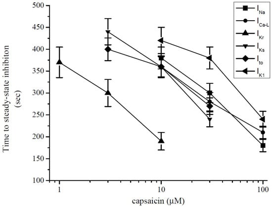 Relationship between time to reach steady-state maximal inhibition and capsaicin concentration for INa, IL-Ca, IKr, IKs, Ito, and IK1 (each data point indicates mean ± SEM from 5–7 cells). Steady-state level was determined when three consecutive data points had the same (within the 97%) values.