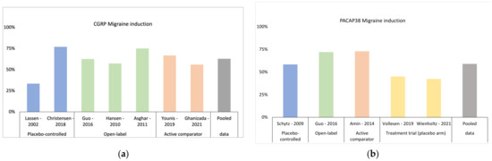 Migraine induction rates in the various provocation studies investigating migraine using calcitonin gene-related peptide (CGRP) (a), and pituitary adenylate cyclase-activating polypeptide-38 (PACAP38) (b), divided into study setups. “Active comparator” denotes the fact that each peptide was tested against another provocation model and “treatment trial” indicates that data has been extrapolated from the placebo arm of a study that sought to inhibit migraine induction by PA-CAP38.