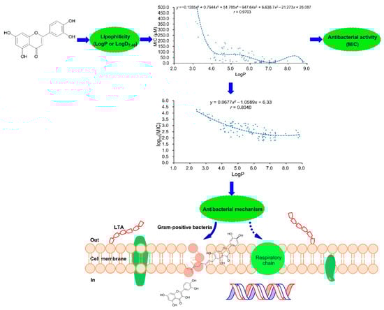 To obtain more scientific and reliable regression equations for the prediction of the MIC values of plant flavonoids, those data, as a greater sample, were reanalyzed, and two regression equations were reestablished. Using statistical methods, a regression equation with a larger correlation coefficient (r) of 0.9703 eventually proved to be the best one for fitting the correlation between the antibacterial activity (MIC) and the lipophilicity (LogP). This equation has shown to be more accurate and more reliable and can be practically considered as the quantitative relationship of plant flavonoids against Gram-positive bacteria. Moreover, the regression curves between the log10 (MIC) (y) and the LogP (or LogD7.40) value (x) provide more intuitive evidence for the correlations between the antibacterial activity and the lipophilicity and for the antibacterial mechanism of the plant flavonoids acting on the cell membrane. The above are diagrammatically presented in Figure 1.