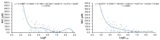 Polynomial regression analyses for the physicochemical parameter LogP or LogD7.40 (x) and the MIC (y) to Gram-positive bacteria, mainly including Staphylococcus aureus, S. epidermidis, or/and Bacillus subtilis of 92 plant flavonoids.