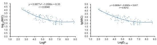 Based on the regression equations previously established and the literature analyses, the antibacterial mechanism of the plant flavonoids acting on the cell membranes of Gram-positive bacteria was proposed [18]. To more intuitively observe the correlation between the antibacterial activity and the lipophilic parameters, the regression analyses for the common logarithm (log10) of the MIC (y) to Gram-positive bacteria and the LogP or LogD7.40 (x) of these plant flavonoids were further performed. Their regression curves and regression equations, with the r values of 0.8040 and 0.8212, are shown, respectively, in Figure 3.