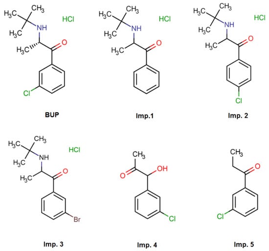 In order to prepare stock solutions, the respective amounts of BUP and impurities were dissolved in methanol. The concentrations of 2 mg/mL for BUP and 100 μg/mL for all the impurities were obtained. Stock solutions were further diluted with methanol–water (50:50, v/v) to obtain working solutions containing 10 μg/mL of each impurity and 100 μg/mL of BUP.