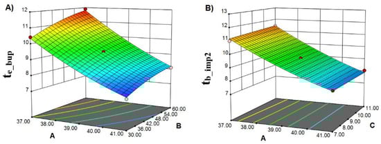 For the given four CMAs, direct modelling was performed. The models with coefficients calculated in terms of coded factors values are given in Table 3. The adequacy of the obtained model was confirmed using an ANOVA test, R2, adjusted R2 (adj. R2), and predicted R2 (pred. R2). For tb_imp3, a linear model (Equation (1)) was suggested as suitable, while for responses te_bup, tb_imp2, and te_imp2, quadratic models (Equation (2)) were proposed. Representative 3D graphs for te_bup and tb_imp2 are given in Figure 2.