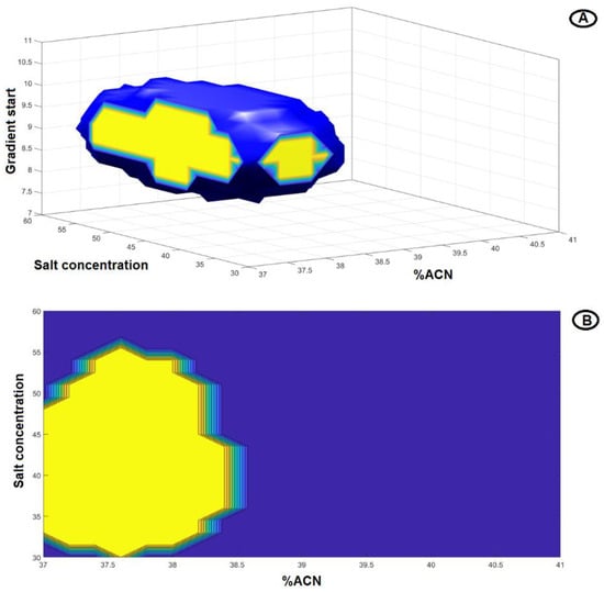 (A) 3D representation of DS for the predefined CMAs achieved with probability π ≥ 85%. (B) 2D representation of DS after setting a fixed value for C (gradient start time) = 10.0 min. The yellow part corresponds to the region of the design space where the working point should be situated.