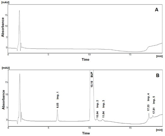Chromatograms obtained under conditions suggested by the working point: (A) placebo mixture of excipients, (B) sample solution containing 400 μg/mL BUP spiked with all impurities at their SL.