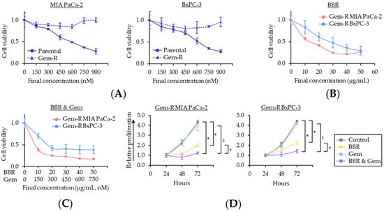 To focus on BBR’s chemosensitization to Gem, Gemcitabine-resistant (Gem-R) PDAC cells were established as described in a previous study []. The cell viability assays using Gem-R PDAC cells revealed that no growth inhibition was observed in Gem-R PDAC cells up to 900 nM concentration range of Gem (Figure 1A). These data confirmed successful establishment of Gem-R PDAC cells (Gem-R MIA PaCa-2 and Gem-R BxPC-3) for subsequent experiments. Next, the anti-cancer activity of BBR was investigated in the growth inhibition of Gem-R PDAC cells, using Cell Counting Kit-8 (CCK-8) assays. BBR hampered the cell viability of Gem-R PDAC cells in a dose-dependent manner, and the IC50 of BBR in these cells were 14.6 μg/mL in Gem-R MIA PaCa-2 and 24.8 μg/mL in Gem-R BxPC-3, which were similar doses to each parental cell (Figure 1B). To further evaluate whether BBR enhanced chemosensitivity to Gem, the cell viability was examined in the combined treatment with BBR and Gem. The IC50 values of the combination treatment were BBR: 8.2 μg/mL, Gem: 123 nM in Gem-R MIA PaCa-2; and BBR: 17.1 μg/mL, Gem: 257 nM in Gem-R BxPC-3 (Figure 1C). In support of our hypothesis, for the proliferation assays with treatment of BBR and Gem individually, and their combination, the combination of BBR and Gem was significantly more effective in the inhibition of cell viability in Gem-R MIA PaCa-2 (fold change [FC] = 0.61 vs. BBR, p < 0.01; FC = 0.31 vs. Gem, p < 0.01) and Gem-R BxPC-3 (FC = 0.64 vs. BBR, p < 0.01; FC = 0.34 vs. Gem, p < 0.01; Figure 1D).
