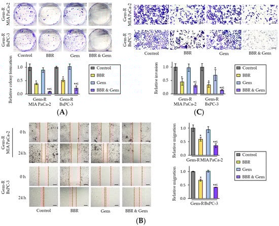 Next, the BBR’s ability to inhibit cellular clonogenicity, migration, or invasion was assessed—which are critical phenotypic features for cancer progression and metastases. The colony formation assays demonstrated that the combination treatment of BBR and Gem resulted in a significantly larger reduction of clonogenicity compared to either treatment individually in Gem-R MIA PaCa-2 (FC = 0.23 vs. BBR, p < 0.05; FC = 0.10 vs. Gem, p = 0.04) and Gem-R BxPC-3 cells (FC = 0.33 vs. BBR, p < 0.05; FC = 0.18 vs. Gem, p < 0.05; Figure 2A). Likewise, with regards to the wound healing and invasion assays, the combination of BBR and Gem significantly hampered cell migration (p < 0.05 vs. BBR; p = 0.01 vs. Gem in Gem-R MIA PaCa-2; p < 0.01 vs. BBR; p < 0.01 vs. Gem in Gem-R BxPC-3; Figure 2B) and invasion (p = 0.06 vs. BBR; p < 0.01 vs. Gem in Gem-R MIA PaCa-2; p = 0.01 vs. BBR; p < 0.01 vs. Gem in Gem-R BxPC-3; Figure 2C). Taken together, these data confirmed that BBR could significantly enhance the anti-cancer potential of Gem and even reverse Gem-resistance in PDAC cells.