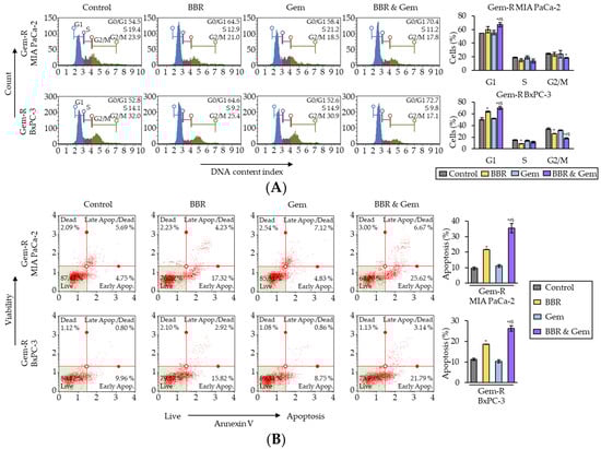 Cell cycle and apoptosis assays were performed using the Muse Cell Analyzer (EMD Millipore Corp, Hayward, CA, USA) according to the manufacturer’s instructions [,,,,,,,,,,]. For the cell cycle assays, cells were seeded in 6-well plates and treated with BBR, Gem, and their combination for 48 h. Thereafter, cells were rinsed with ice-cold phosphate-buffered saline (PBS), fixed with 200 μL of ice-cold 70% ethanol and incubated at −20 °C for more than 3 h. Two hundred microliters of MuseTM Cell Cycle Reagent (EMD Millipore Corp) were used in staining cells. The results were measured using the Muse Cell Analyzer. For the apoptosis assays, after 48 h treatment, 100 μL of Muse Annexin V & Dead Cell Reagent (Luminex Corp, Austin, TX, USA) were added into 100 μL of cell suspension by PBS. The apoptotic cell fraction was analyzed using the Muse Cell Analyzer.