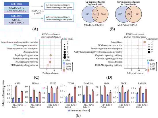 To elucidate the key regulatory pathways associated with Gem-resistance in PDAC cells, the gene expression profiling results were compared between parental and Gem-R PDAC cells from transcriptomic profiling datasets (GSE148200 and GSE140077). This analysis revealed 1354 up- and 1066 down-regulated (log2FC > ±1.0, p < 0.01) genes in MIA PaCa-2, and 2281 up- and 1690 down-regulated genes in BxPC-3 (Figure 4A). Among them, there were 241 up-regulated and 174 down-regulated genes that overlapped in both PDAC cells (Figure 4B).