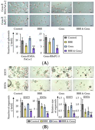 Three-dimensional (3D) cultures, such as 3D spheroids and tumor organoids, are conceived as physiologically superior to the conventional monolayer cell cultures for the study of anti-cancer agents [,]. Therefore, 3D culture models were finally used to validate our cell culture findings. First, the sphere formation assays were performed using Gem-R PDAC cells with treatment of BBR, Gem, and their combination. With regards to the sphere formation assays, the combined treatment with BBR and Gem significantly inhibited the sphere forming ability of both Gem-R MIA PaCa-2 (p = 0.04 vs. BBR; p < 0.01 vs. Gem) and Gem-R BxPC-3 (p = 0.10 vs. BBR; p = 0.02 vs. Gem; Figure 6A).