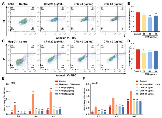 Cytotoxicity of CPM. (A,C) Apoptosis analysis in K562 and Meg-01 cells after treatment with or without CPM (20, 40 and 80 µg/mL) for 5 days. Q2 (Annexin+ PI+) denotes late apoptotic. Q3 (Annexin+ PI−) denotes early apoptotic cells. (B,D) Q2 + Q3 represents total apoptotic cells. Statistical analysis of apoptotic cells (Q2 + Q3) of K562 and Meg-01 cells in each group. Data are means ± SD (n = 3). (E,F) Detection of LDH activity of K562 and Meg-01 cells after treatment with or without CPM (20, 40 and 80 µg/mL) for 2, 4 and 6 days. Maximum LDH control represents the total amount of LDH present in the cells. Data are mean ± SD (n = 3, ANOVA). * p < 0.05, ** p < 0.01, *** p < 0.001 vs. the control group. ### p < 0.001 vs. the maximum LDH control.