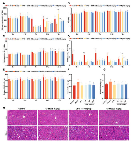 The therapeutic effects of CPM on RIT mice. The KM mice aged 6–8 weeks were irradiated and then administrated with normal saline, TPO (3000 U/kg), or CPM (75, 150 and 300 mg/kg) solubilized in normal saline for 12 days, respectively. Each group included 8 randomly assigned mice (4 male mice and 4 female mice). Routine blood examination was conducted on days 0, 4, 7, 10 and 12. (A) Platelet counts in each group. Data are mean ± SD (n = 8). (B) MPV in each group. Data are mean ± SD (n = 8). (C) RBC counts in each group. Data are mean ± SD (n = 8). (D) WBC counts in each group. Data are mean ± SD (n = 8). (E) Body weight in each group. Data are mean ± SD (n = 8). (F) Liver index in each group on day 12. Data are mean ± SD (n = 8). (G) Kidney index in each group on day 12. Data are mean ± SD (n = 8, ANOVA). * p < 0.05, ** p < 0.01, *** p < 0.001 vs. the model group. (H) H&E staining of the liver and kidney in each group on day 12. Bars: 200 µm.