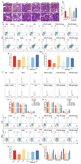 BM is generally thought to be the major region of thrombopoiesis from MKs [7]. To further explore the role of CPM in raising platelets in vivo, H&E staining was conducted to reveal whether CPM promoted megakaryopoiesis. The results demonstrated that the number of MKs in CPM (75, 150 and 300 mg/kg) and TPO-treated groups was higher than that of the model group (Figure 4A,B), indicating that CPM could enhance megakaryopoiesis in BM. Then, the surface antigens CD41 and CD61, known as MK differentiation markers, were measured in BM and spleen cells. The results revealed that the proportions of CD41+CD61+ cells in groups treated with CPM (75, 150 and 300 mg/kg) and TPO were obviously elevated when compared with the model group in BM and spleen cells (Figure 4C–E), indicating CPM promoted MK differentiation in BM and spleen. Moreover, we found a notable increase in proportions of 4 N and ≥8 N cells in BM and spleen after CPM (75, 150 and 300 mg/kg) and TPO treatments (Figure 4F–H), demonstrating that CPM administration stimulated MK maturation in BM and spleen. Correspondingly, CD41+CD61+ cell proportions in PB were markedly increased after CPM (75, 150 and 300 mg/kg) and TPO treatments (Figure 4I,K), suggesting that CPM accelerated MK differentiation in PB. Collectively, the above data suggested that CPM was able to accelerate platelet production by promoting MK differentiation and maturation in BM and spleen. Furthermore, p-selectin (also termed CD62p) was examined, which characterized platelet activation. As a result, the proportions of CD41+CD62p+ cells (platelets) in groups with CPM (75, 150 and 300 mg/kg) and TPO treatments were much higher than in the model group (Figure 4J,L). The percentage of CD41−CD62p+ cells (activated platelets) was significantly higher in the groups treated with CPM (150 and 300 mg/kg) and TPO than in the model group (Figure 4J,L). To sum up, all these results indicate that CPM enhances MK differentiation and maturation, platelet generation and activation without toxicity, which appears to have excellent therapeutic effects on RIT mice.