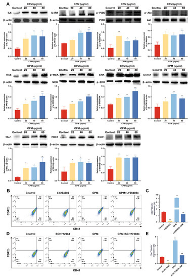 The expression of proteins belonged to PI3K/Akt and MEK/ERK signaling pathways was detected by western blotting. The results showed that CPM (20, 40 and 80 µg/mL) significantly induced the expression of IL-6 and IL1R1, located upstream of PI3K/Akt signaling pathway, activated the expression of p-PI3K and p-Akt (Figure 6A), which indicated that CPM activated PI3K/Akt signaling pathway. CPM (20, 40 and 80 µg/mL) could also significantly activate phosphorylation of RAS, MEK1/2 and ERK1/2 (Figure 6A), suggesting that CPM was able to activate MEK/ERK signaling pathway. Moreover, the expression of several transcription factors (TFs), including PBX1, GATA1, EGR1 and TAL1, involved in MK differentiation were measured. The results demonstrated that CPM (20, 40 and 80 µg/mL) obviously induced PBX1, GATA1, EGR1 and TAL1 expressions (Figure 6A). To further ascertain the close association of CPM action on MK differentiation with the above two signaling pathways, LY249002 and SCH772984, acknowledged inhibitors of PI3K/Akt and MEK/ERK signaling pathways were used, respectively. As expected, LY294002 and CPM co-treatment notably reduced the expression of CD41 and CD42b compared with CPM treatment (Figure 6B,C), which indicated that suppression of PI3K/Akt signaling pathway by LY294002 blocked MK differentiation induced by CPM. Similarly, combined treatment of SCH772984 and CPM attenuated CD41 and CD42b expression compared with CPM treatment (Figure 6D,E), suggesting that blockage of MEK/ERK signaling pathway by SCH772984 abolished CPM’s effect on MK differentiation. Based on the above results, we conclude that CPM activates PI3K/Akt and MEK/ERK signaling pathways, causing downstream activation of hematopoietic TFs (GATA1, TAL1, PBX1 and EGR1), thereby stimulating MK differentiation.