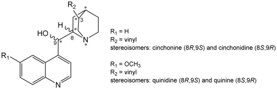 General structures of main Cinchona alkaloids. “*” denotes five chiral centers in the molecules.