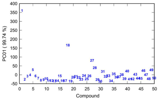Classification of compounds 1–50 based on values calculated by PCA performed on the mean-centered covariance matrix of their inhibition of AChE and BChE. (Compound labels: 1 CD; 2 CD Bzl; 3 CD 2F; 4 CD 3F; 5 CD 4F; 6 CD 3CF3; 7 CD 4CF3; 8 CD 3,5F; 9 CD 3,4F; 10 CD 2,3F; 11 CD 2,4F; 12 CD 2,6F; 13 CD 3OCF3; 14 CD 4OCF3; 15 CD 2F-6CF3; 16 CD 4Br-2F; 17 CD 2Cl-6F; 18 DHCD; 19 DHCD Bzl; 20 DHCD 3F; 21 DHCD 4F; 22 DHCD 3CF3; 23 DHCD 4CF3; 24 DHCD 3OCF3; 25 DHCD 4OCF3; 26 CN; 27 CN Bzl; 28 CN 2F; 29 CN 3F; 30 CN 4F; 31 CN 3CF3; 32 CN 4CF3; 33 CN 3,5F; 34 CN 3,4F; 35 CN 2,3F; 36 CN 2,4F; 37 CN 2,6F; 38 CN 3OCF3; 39 CN 4OCF3; 40 CN 2F-6CF3; 41 CN 4Br-2F; 42 CN 2Cl-6F; 43 DHCN; 44 DHCN Bzl; 45 DHCN 3F; 46 DHCN 4F; 47 DHCN 3CF3; 48 DHCN 4CF3; 49 DHCN 3OCF3; 50 DHCN 4OCF3).