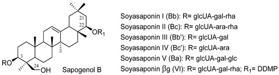 Lentils, together with other legumes such as broad beans and kidney beans, are the main source of saponins in the human diet [37]. Lentils contain mainly triterpenoid glycosides; in particular, group A and B saponins and soyasaponin I (Bb), along with soyasaponin βg (VI) are the most representative compounds of this class [41]. Both are monodesmosidic saponins, with sapogenol B as aglycone, except for soyasaponin βg (VI), containing a 2,3-dihydro-2,5-dihydroxy-6-methyl-4H-pyran-4-one (DDMP) group at C-22, which generates major radical scavenger activity against reactive oxygen species (ROS) [42]. In addition, this saponin is considered a natural precursor of soyasaponin I, since the DDMP group is thermolabile [43]. Besides the common saponins reported in lentils, soyasaponin II (Bc) and Bd have been identified in 80% methanol extracts of lentils seeds by Ha et al. [44], while Herrera et al. [45] also identified a group A saponin along with soyasaponin I and two other group B saponins in dried extract of lentil seeds.