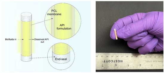 (Left) A schematic of a PCL reservoir-style implant containing formulated API inside the reservoir and the dissolved drug releasing into to the surrounding medium. (Right) A digital camera image of a 10mm-long biodegradable implant containing surrogate drug formulation.