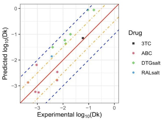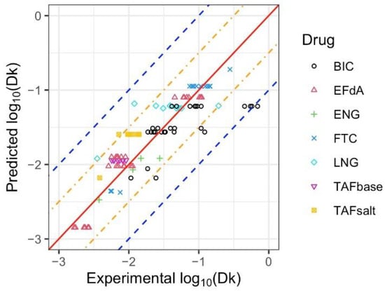 We demonstrated that the model provided an adequate fit predicting empirical parameters close to experimental values for the APIs tested above. Here, the developed model was used to predict the release rate of four additional antiretrovirals (RALsalt, 3TC, DTGsalt, and ABC), each having unique physicochemical properties as outlined in Table 3 and Table S2. Using Equation (4), the predicted values were determined and the resultant comparison of the predicted () values with the experimental values is shown in Figure 4. A good agreement exists between the experimental and predicted values, where all of the predicted values reside between two blue dashed lines, meaning that the predicted values were in the range of 1/10 and 10 times of the experimental values. The mean squared errors of the linear regression, support vector machine, and random forest models were 0.382, 0.498, 0.599, respectively, suggesting an adequate fit of the linear regression model.