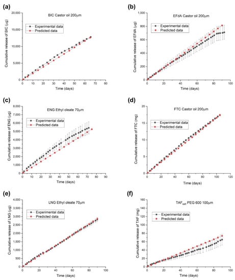 Predicted and experimental release profiles of implants containing a single drug with individual configurations: (a) BIC (castor oil, PC-17, 40 mm length, 200 μm wall thickness, drug to excipient ratio: 2:1), (b) EFdA (castor oil, PC-17, 10 mm length, 200 μm wall thickness, drug to excipient ratio: 1:1), (c) ENG (ethyl oleate, Sigma, 10 mm length, 70 μm wall thickness, drug to excipient ratio: 1:4), (d) FTC (castor oil, PC-17, 40 mm length, 200 μm wall thickness, drug to excipient ratio: 1:1), (e) LNG (ethyl oleate, Sigma, 10 mm length, 70 μm wall thickness, drug to excipient ratio: 1:4), and (f) TAFsalt (PEG600, Sigma, 40 mm length, 100 μm wall thickness, drug to excipient ratio: 2:1).