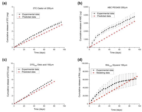 Predicted and experimental release profiles of implants containing a single ARV with individual configurations: (a) 3TC (castor oil, PC-17, 40 mm length, 200 μm wall thickness, drug to excipient ratio: 2:1), (b) ABC (PEG400, PC-17, 10 mm length, 200 μm wall thickness, drug to excipient ratio: 2:1), (c) DTGsalt (oleic acid, PC-31, 10 mm length, 150 μm wall thickness, drug to excipient ratio: 2:1), and (d) RALsalt (glycerol, PC-31, 40 mm length, 150 μm wall thickness, drug to excipient ratio: 2:1).