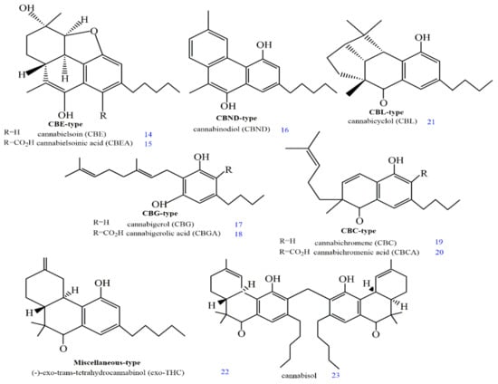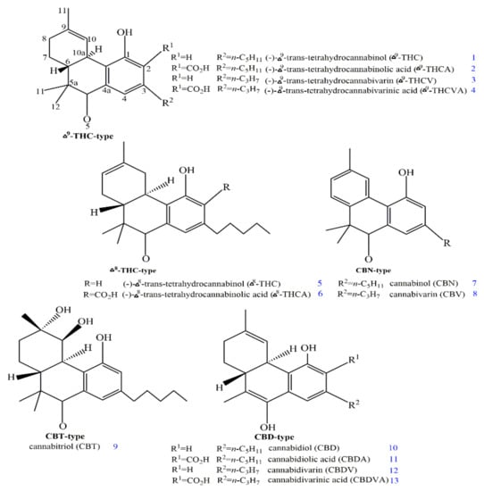 C. sativa naturally produces cannabinoids, which typically have C21 and C22 terpenophenolic structures with varying oxidation patterns. There are currently approximately 120 phytocannabinoids discovered, and they can be divided into 11 different broad skeletal types, as summarised in Figure 1 [,]. The type of cannabinoids, such as delta-9-tetrahydrocannabinol (Δ9-THC-type) (1) [], contains a tricyclic 6a,7,8,10a-tetrahydro-6H-benzo[c]chromen-1-o1 core structure, and its main representatives such as (-)-Δ9-trans-tetrahydrocannabinolic acid (Δ9-THCA) (2) and (-)-Δ9-trans-tetrahydrocannabinol (Δ9-THC) (1) include highly abundant cannabinoids of C. sativa [,]. Moreover, a class of cannabinoids such as Δ8-THC-type contains isomers of class Δ9-THC-type, demonstrating the same 6a,7,8,10a-tetrahydro-6H-benzo[c]chromen-1-o1 core structure with a double bond []. The Δ8-trans-tetrahydrocannabinol (Δ8-THC) (5) is considered to be a major representative of this form and its concentration in plants is usually negligible due to the isomerisation of thermodynamically less stable double bond isomers such as Δ9-THC (1) []. Cannabinoids of the cannabinol (CBN)-type share a similar core structure of 6H-benzo[c]chromen-1-ol with oxidised aromatic rings []. A comparatively minor constituent of C. sativa such as cannabinol (CBN) (7) is the primary representative of this class []. Although the content of CBN (7) increases in plant materials when oxidised, Δ9-THC (1) is processed in the presence of oxygen []. High concentrations of the thermodynamically more stable cannabinoids CBN (7) and Δ8-THC (5) can be found in processed cannabis products such as hashish and cannabis oil []. Additionally, the family of CBT-type cannabinoids, including cannabitriol (CBT) (9), clearly distinguishes itself from the Δ9-THC-type cannabinoids by exhibiting a vicinal 9,10-trans-diol in the upper ring [].