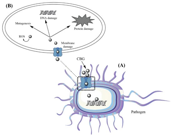 Schematic illustration of antibacterial mechanism of cannabinoid, with CBG (17) as an example. CBG (17) causes bacterial cytoplasmic membrane damage (A) that results in the destruction of protein and DNA and the production of reactive oxygen species (ROS) within the bacterial cell (B) (created with ChemDraw Professional).