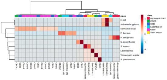 The quantitative values of various compounds of cannabinoids were compared with those of microbial strains. The correlation between these values and the strains of microbes was also discussed, as shown in Figure 3. It was observed that CBD 2 and 3 (10) show a positive correlation against N. gonorrhoeae and S. pneumoniae due to the structure–activity relationships of cannabidiol analogs, while CBD 1 (10) has a negative correlation towards bacterial strains. Various factors that affect the development and maintenance of microbial strains in a variety of cannabidiol analogs can be considered. Some of these include the size, concentration, and exposure time of cannabinoids []. Different strains of bacteria were used in different studies, which means that the results of the studies were different from those of the previous studies. Moreover, CBCA 3 (20) exhibits the most significant antimicrobial property due to its strong interactions with the microbial cell membrane, the induction of oxidative stress inside the cell, and the disruption of the metabolic function, resulting in microbial cell lysis. Both concentration and exposure time play a very important role in improving the antimicrobial activity of different cannabidiol analogs. Previous studies show that antimicrobial activity increases as the concentration and exposure time increase []. Similarly, seed extract 2 shows a positive correlation against bacterial cells due to a number of proteins and peptides produced by seed extracts with antibacterial activities, while seed extract 1 demonstrates a less significant correlation towards bacterial strains. Aqueous extract 3 also demonstrated significant antibacterial activities against S. aureus due to strong bacterial cell membrane interaction. However, various others compound of cannabinoids demonstrate an intermediate level of correlation against different bacterial strains because of weak electrostatic interactions between compounds and microbes. With the potential to create novel analogs with narrow spectrum, selective Gram-negative activity against the harmful pathogen N. gonorrhoeae, CBD (10) represents the prototype member of a promising structural class of antibiotics []. A new class of compounds has been discovered that is capable of treating the most common forms of gonorrhoeae resistance. However, it is not yet clear if these compounds can be utilised in a systemic manner due to concerns about the emergence of “superbugs” []. Trials are currently being conducted with respect to the use of CBD (10) in treatments for other conditions, such as nasal colonisation []. Studies have shown that cannabidiol compounds have a potential to become a useful new antimicrobial agent.