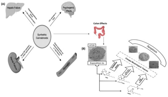 Schematic illustration of (A) proposed mechanisms of synthetic cannabinoids end-organs effects, and (B) their cytotoxic effects on human HT-29 colorectal adenocarcinoma cells (reprinted with permission from [,]; copyright (2019) (2020) ACCP; MDPI; the articles were printed under a CC-BY license).
