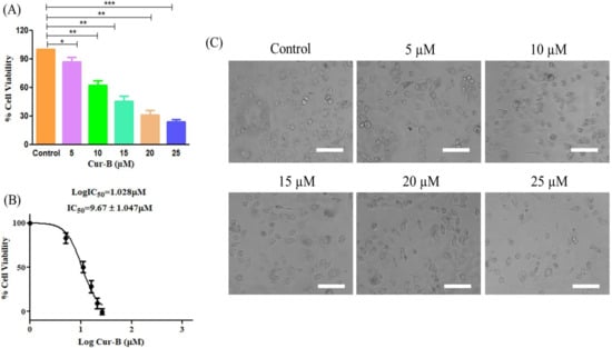 Cytotoxic effects of Cur-B against PC-3 cells as evaluated through MTT assay: (A) changes in cell viability percentage, (B) IC50 value of Cur-B against PC-3 cells and (C) changes in morphology of PC-3 cells upon exposure to various Cur-B concentrations after 24 h. Scale bar = 100 µm. * p < 0.05, ** p < 0.01, *** p < 0.001.