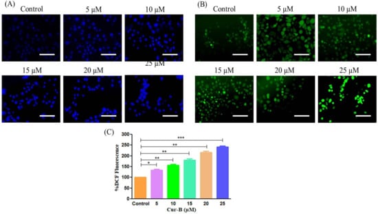 Instigation of ROS post Cur-B exposure within PC3 cells was qualitatively assessed through DCFH-DA stain as per the procedure described earlier [,]. Precisely, 5 × 103 PC3 cells/well were incubated overnight in a 96-well plate to allow adherence under optimum culture conditions. Thereafter, cells were treated with Cur-B (at stated concentrations) and incubated for an additional 12 h. Media from each well was decanted, and cells were re-treated with 10 μM DCFH-DA (30 min incubation at RT in dark). At the concluding step, the cells were washed using PBS prior to imaging at a wavelength ratio of excitation: 482/18 nm–emission: 532/59 nm through the green channel of a FLoid imaging station, Thermo-Scientific, USA.