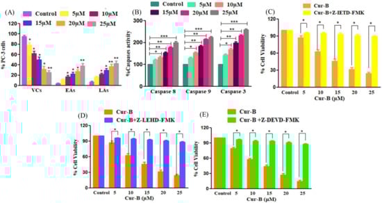 Quantification of Cur-B-instigated (A) apoptosis, (B) Cur-B mediated activation of caspase-8, -9 and -3 and (C–E) cytotoxic effects of Cur-B against caspase inhibitor pretreated PC-3 cells. VCs, viable cells; LAs, late apoptotic cells; EAs early apoptotic cells. * p < 0.05, ** p < 0.01, *** p < 0.001.