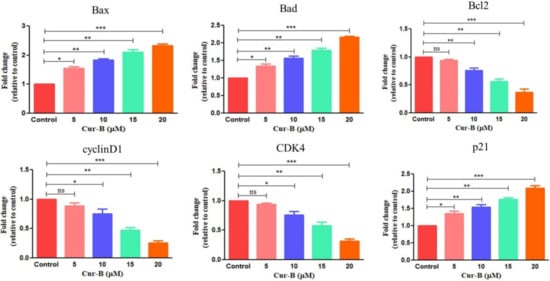 The effect of Cur-B on modulating expression of genes involved in the cell cycle was further evaluated through qRT-PCR. As presented in Figure 6, Cur-B reduced mRNA expression of cyclin D1, exhibiting a dose-dependent trend. Exposure of PC-3 cells to Cur-B considerably reduced expression of cyclin D1 mRNA 0.88 ± 0.04 (5 µM); 0.75 ± 0.06 (10 µM); 0.47 ± 0.03 (15 µM) and 0.25 ± 0.05 (20 µM) fold compared with untreated control. Additionally, the expression of p21Cip1 mRNA was elevated by 1.34 ± 0.06 (5 µM); 1.54 ± 0.05 (10 µM); 1.76 ± 0.03 (15 µM) and 2.09 ± 0.05 (20 µM) fold against the control. Thereafter, the effect of Cur-B in regulating CDK4 expression in PC-3 cells was further evaluated using qRT-PCR. The expression of CDK4 was curtailed up to 0.93 ± 0.02 (5 µM); 0.76 ± 0.04 (10 µM); 0.57 ± 0.05 (15 µM) and 0.31 ± 0.03 (20 µM) fold in juxtaposition with untreated control.