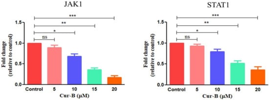 Effect of Cur-B in modulating the mRNA expression of important genes involved in JAK1/STAT1 signaling. * p < 0.05, ** p < 0.01, *** p < 0.001.
