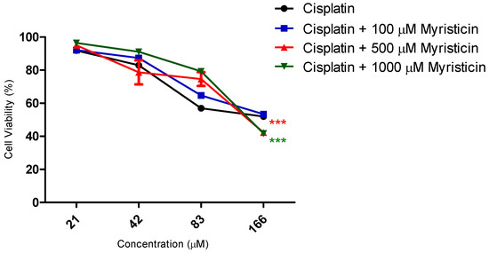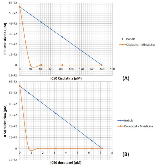 After obtaining the IC50 values of myristicin and the chemotherapeutic agents docetaxel and cisplatin, the cells received joint treatments with myristicin–docetaxel and myristicin–cisplatin, respectively, during 48 h of incubation and, at the end of this treatment time, the cells were stained with MTT and absorbance data were analyzed and compiled into graphs relating the percentage of cell growth to the concentration of the sample, as already described.