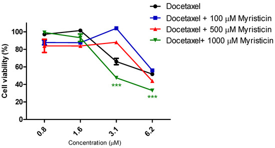 Cytotoxic activity of the compound myristicin in association with the chemotherapy drug docetaxel. Assay performed with the NCI/ADR-RES tumor line, relating the percentage of cell viability versus concentration of docetaxel, after 48 h of incubation.