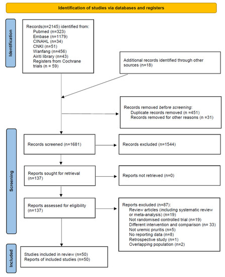 We used a PRISMA flowchart to illuminate the process of identifying and selecting RCTs in evaluating the effects of CHM for UP patients (Figure 1). We identified 2145 articles from electronic databases and 18 additional records obtained through other sources. We excluded 1544 articles based on their titles and abstracts. We then reviewed the full texts of the remaining 137 articles. We excluded 87 articles due to the following reasons: 19 studies were review articles, 19 studies were not RCTs, 33 studies involved different interventions, 5 studies did not involve UP patients, 8 studies did not report data, 2 studies involved overlapping populations, and 1 study was retrospective. We qualitatively and quantitatively synthesized the remaining 50 articles.