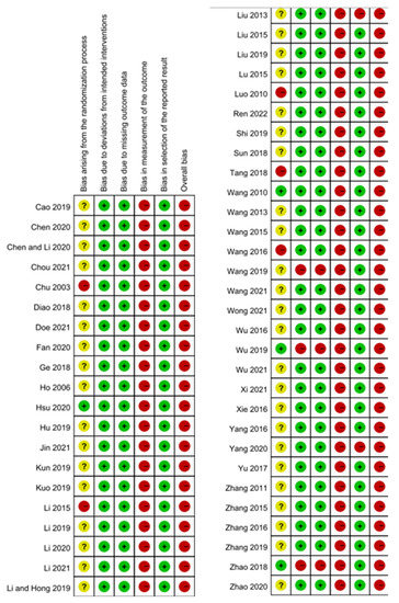 Risk of bias is presented in Figure 2. In the randomizing process, thirty-four studies mentioned the methods of randomization. Only four studies [19,27,28,34] revealed details about their allocation concealment. Five studies [20,22,23,56,60] did not describe the baseline conditions of patients or provide statistical data, both of which could result in baseline imbalances. In addition, no double blinding was performed in the reviewed trials. Three studies [27,34,54] were not intention-to-treat analyses and had more than 5% of losing outcome data. Bias of outcome measurements, including visual analog scale, itch-intensity ratings, overall effectiveness, and quality of life scale, were high based on self-assessment. Two studies [32,63] were potentially biased because they only reported a subset of their data.